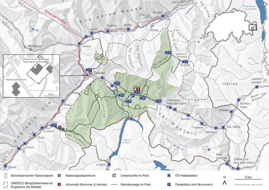Im Besucherzentrum in Zernez sind eine interaktive Dauerausstellung über den Nationalpark, saisonale Sonderausstellungen zu Naturthemen sowie Infostelle und Shop untergebracht. Eine breite Palette von Exkursionsangeboten erlaubt das Eintauchen in die Wildnis des Nationalparks. Kinder- und Familienexkursionen fördern das spielerische Entdecken unserer Umwelt schon bei den Kleinsten. Besonders beliebt ist der Kinderpfad Champlönch mit der GPS-gestützten App iWebpark.